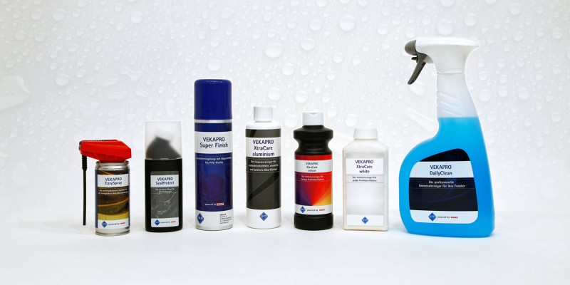 Da bi visokokvalitetni PVC-U prozori bili udobni i lepi kao prvog dana, preporučuju se specijalna sredstva za čišćenje i negu iz VEKAPRO asortimana. Pažljivo usklađeni i dostupni kao praktični setovi, proizvodi garantuju savršene rezultate za svu negu prozora.